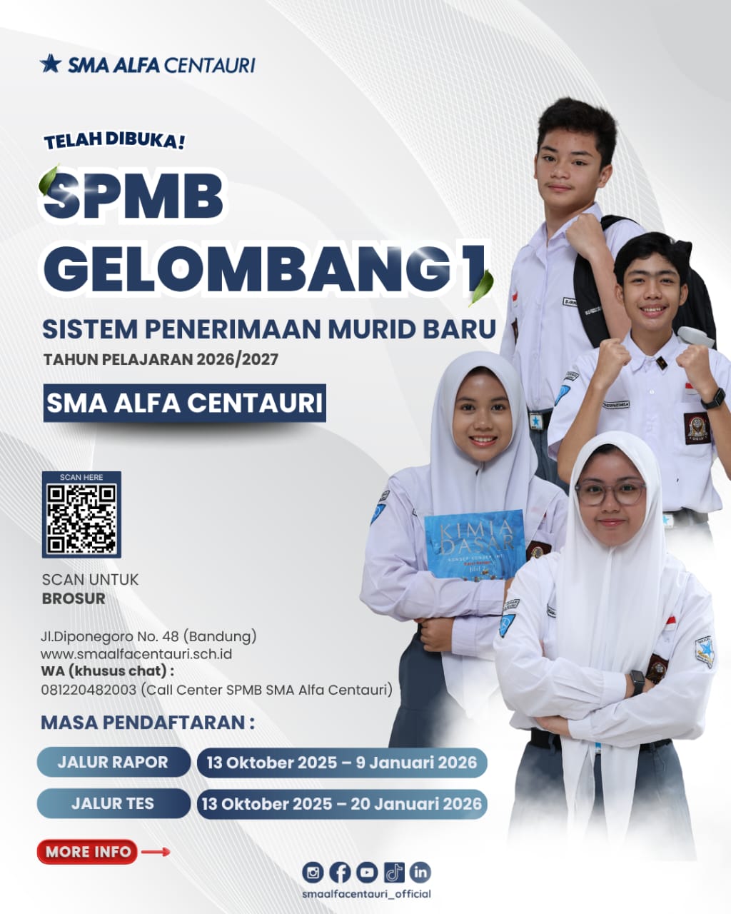 Alhamdulillah, kabar gembira yang telah dinantikan akhirnya tiba! Pendaftaran Sistem Penerimaan Murid Baru (SPMB) Gelombang 1 SMA Alfa Centauri untuk tahun ajaran 2026/2027 akan segera dibuka!