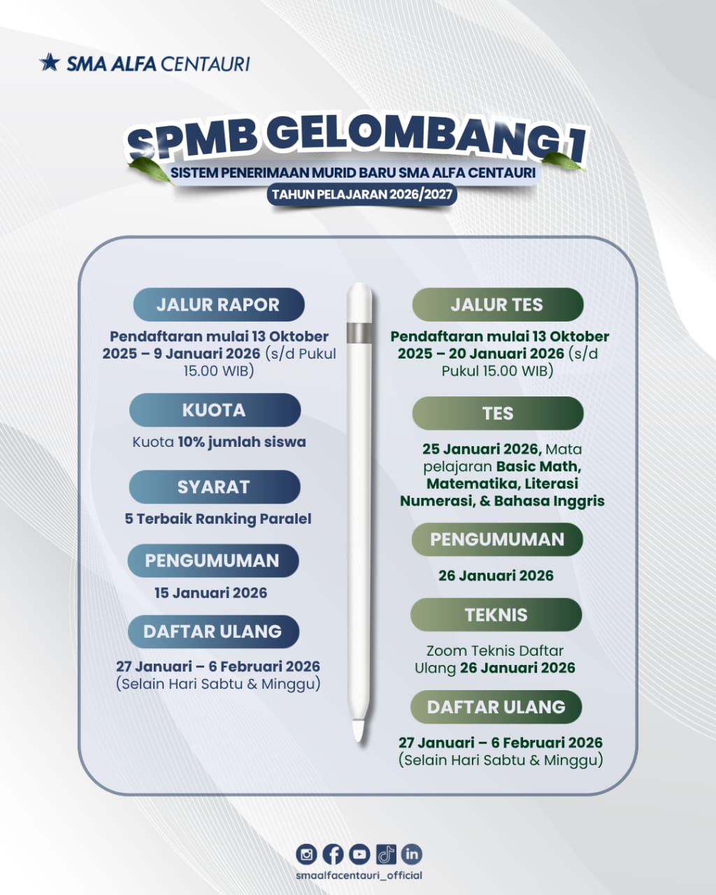 Alhamdulillah, kabar gembira yang telah dinantikan akhirnya tiba! Pendaftaran Sistem Penerimaan Murid Baru (SPMB) Gelombang 1 SMA Alfa Centauri untuk tahun ajaran 2026/2027 akan segera dibuka!